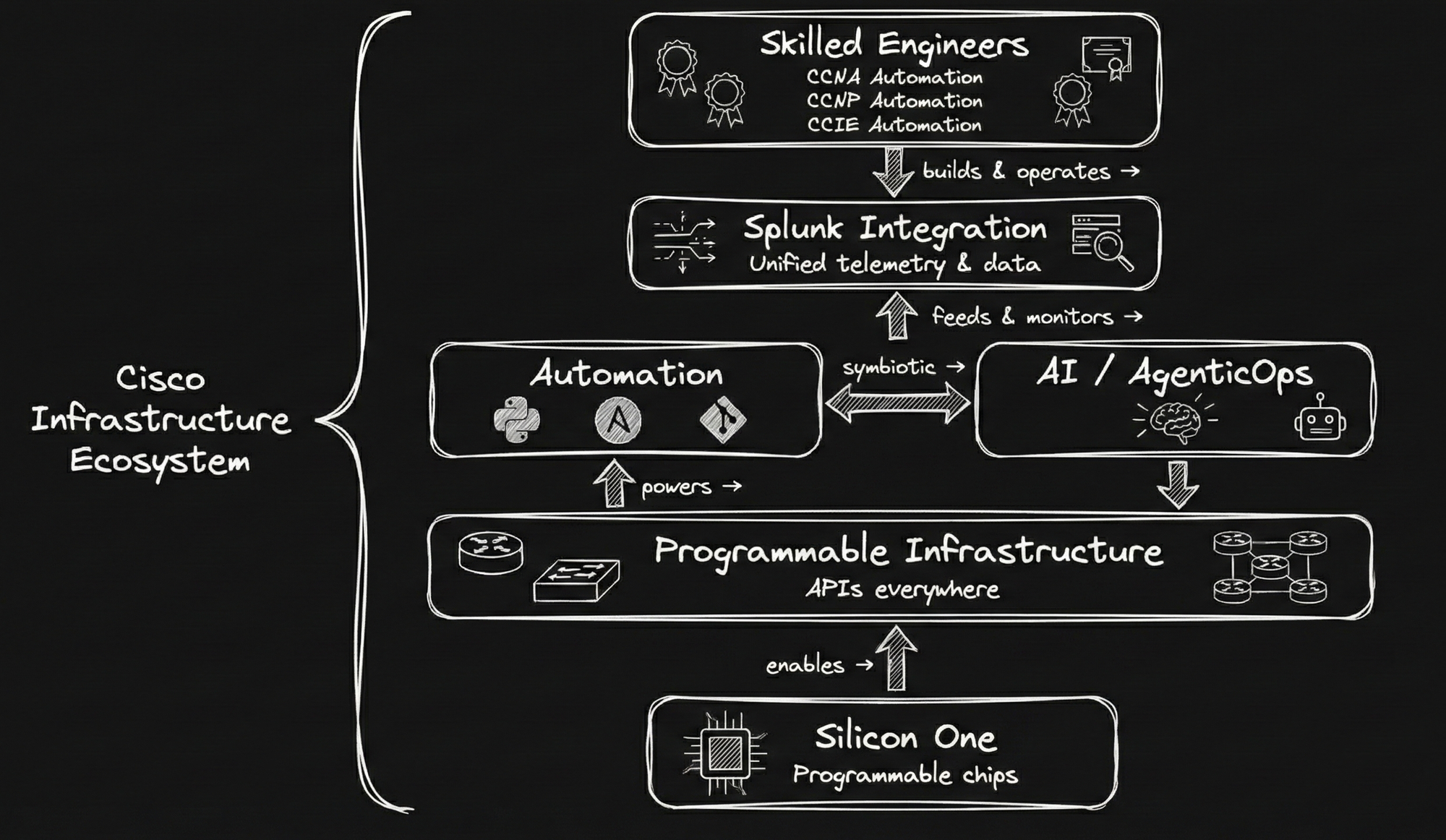 They're building networks that are programmable by default, with APIs baked into everything. Operations become data-driven through unified telemetry and Splunk integration. Intelligence gets embedded via AI agents that act on automation frameworks. And now, with CCNA/CCNP/CCIE Automation, the skills get standardized in a way that enterprises and hiring managers actually understand.