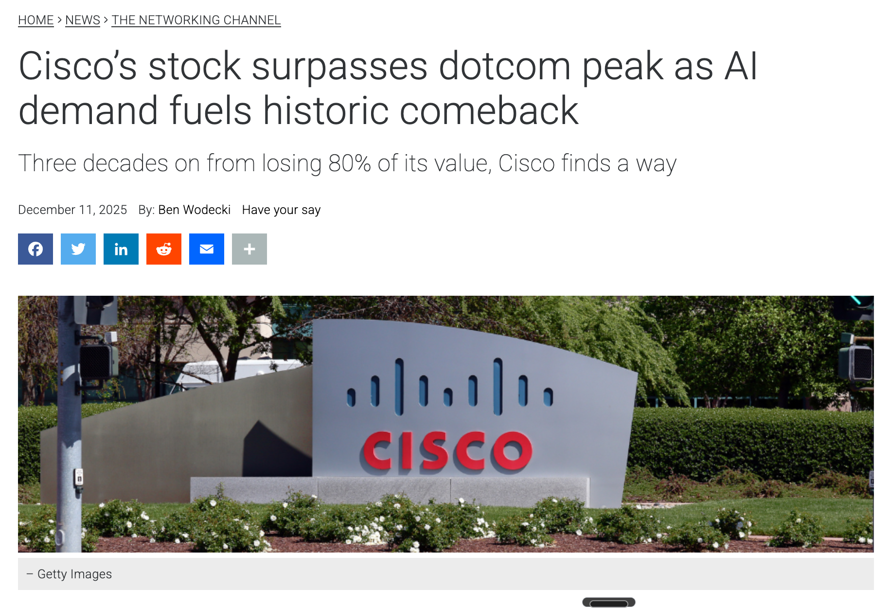 “Cisco’s Stock Surpasses Dotcom Peak as AI Demand Fuels Historic Comeback.”